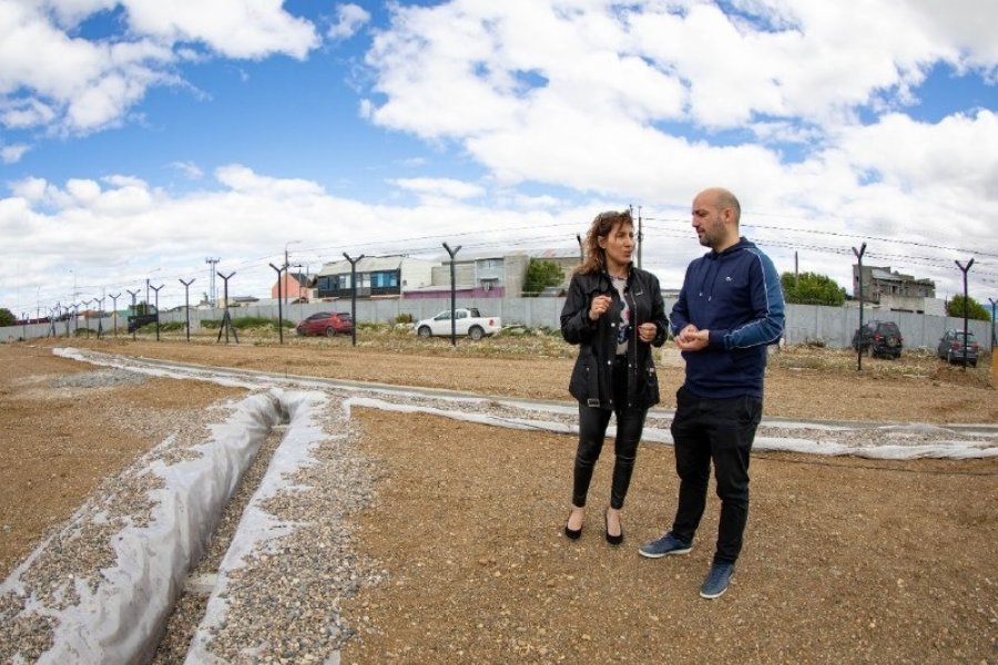 La secretaria de Obras Públicas, Silvina Mónaco, recorrió junto al gerente de la Agencia de Deportes, Cultura y Juventud, Sebastián Bendaña, los trabajos en la Cancha de Césped Sintético del Centro Deportivo Municipal.