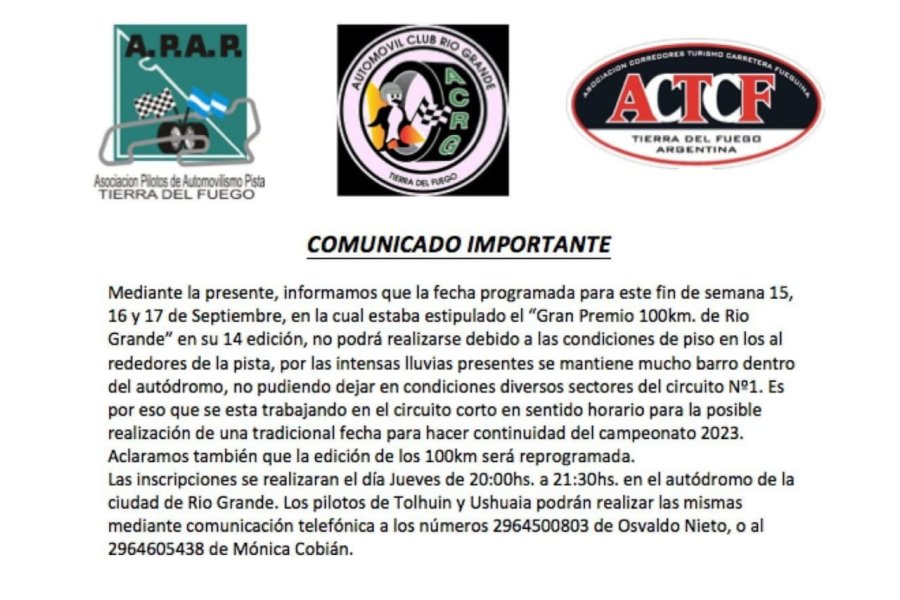 Mediante la presente, informamos que la fecha programada para este fin de semana 15, 16 y 17 de Septiembre, en la cual estaba estipulado el "Gran Premio 100km. de Rio Grande" en su 14 edición, no podrá realizarse debido a las condiciones de piso en los al rededores de la pista, por las intensas lluvias presentes se mantiene mucho barro dentro del autódromo, no pudiendo dejar en condiciones diversos sectores del circuito Nº1. Es por eso que se esta trabajando en el circuito corto en sentido horario para la posible realización de una tradicional fecha para hacer continuidad del campeonato 2023.Aclaramos también que la edición de los 100km será reprogramada.Las inscripciones se realizaran el día Jueves de 20:00hs. a 21:30hs. en el autódromo de la ciudad de Rio Grande. Los pilotos de Tolhuin y Ushuaia podrán realizar las mismas mediante comunicación telefónica a los números 2964500803 de Osvaldo Nieto, o al2964605438 de Mónica Cobián.