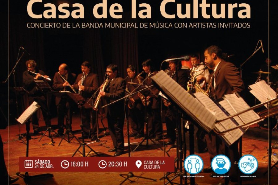 En el marco del 34º aniversario de la Casa de la Cultura, y en el contexto del Centenario de la Ciudad, la Banda de Música Municipal brindará, el próximo sábado 24 de abril, una doble jornada de conciertos, que deleitará a los presentes con un amplio repertorio y contará con la participación de artistas invitados. Las veladas serán una a las 18:00 y otra a las 20:30 horas y es con cupo limitado dada la situación epidemiológica.