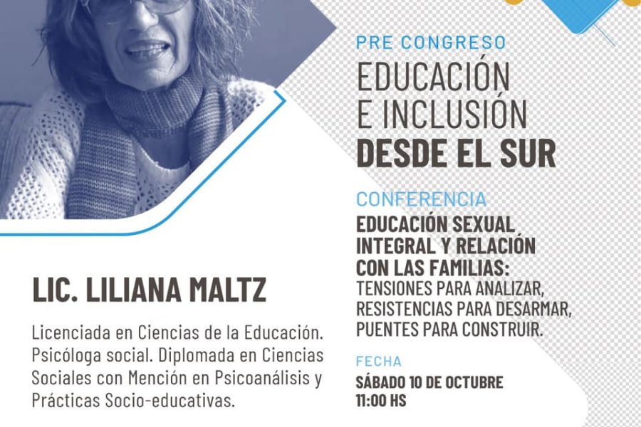 En esta oportunidad, la conferencia denominada “Educación sexual integral y relación con las familias: tensiones para analizar, resistencias para desarmar, puentes para construir”, estará a cargo de la Licenciada en Ciencias de la Educación, Liliana Maltz, quien además es psicóloga social y diplomada en Ciencias Sociales con mención en Psicoanálisis y prácticas Socioeducativas.