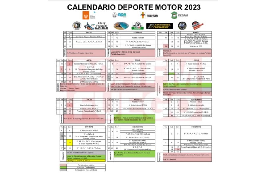 Los 12 meses del año habrá actividad, iniciándose el fin de semana del 7 y 8 de enero con Picadas en Tolhuin y el tradicional evento de reyes en el autódromo de Río Grande y finaliza el 17 de diciembre con el Súper Especial en el autódromo de Río Grande.