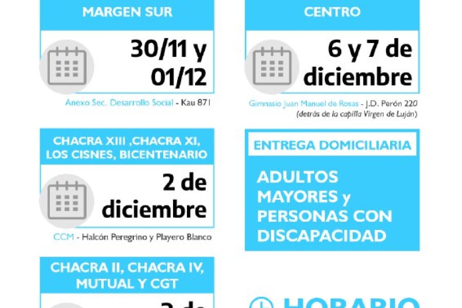 El viernes 3 de diciembre la entrega será en el Centro Comunitario Municipal del CGT (Victoria Ocampo y Rufino), para los barrios Chacra II, Chacra IV, Mutual y CGT. Finalmente, los días lunes 6 y martes 7 de diciembre, se realizará la entrega para los vecinos y vecinas de la zona Centro en el gimnasio Juan Manuel de Rosas, ubicado en Juan Domingo Perón 220.