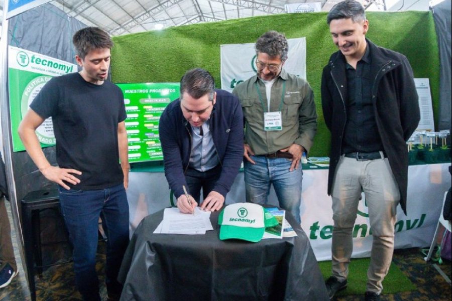 La firma del acuerdo se llevó a cabo este martes, con la presencia del intendente Martín Pérez, el director Institucional de Tecnomyl, Pablo Adrián Mocchi, y el presidente de Río Grande Activa, Juan Pablo Deluca. Además, acompañó el subsecretario de Desarrollo Productivo, Facundo Armas, quien destacó la importancia de la participación de Tecnomyl en este proyecto y en la Expo Agroproductiva anual, un evento clave para el sector productivo de la región.
