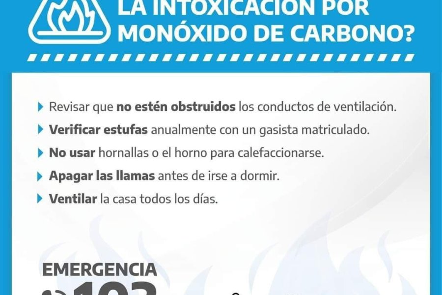Finalmente, desde el área recomendaron que, ante la sospecha de intoxicación por monóxido de carbono, se debe retirar a los afectados del ambiente contaminado y llevarlos a un sitio donde puedan respirar aire limpio. Luego, comunicarse con algún centro de urgencias o bien acercarse al Centro de Salud más cercano.