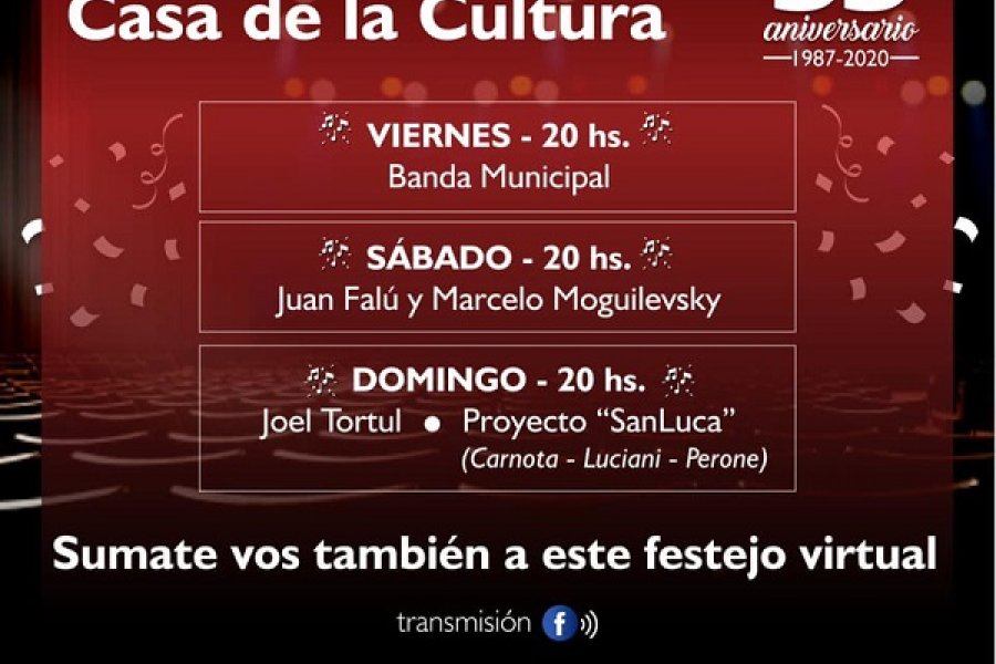 La casa de la cultura de nuestra ciudad, está cumpliendo 33 años y con motivo de su celebración se realizará un festejo virtual, en el cual a partir de hoy y durante todo el fin de semana, a las 20 horas se estarán ofreciendo conciertos históricos para que todos aquellos que así lo deseen puedan disfrutarlo desde su casa.