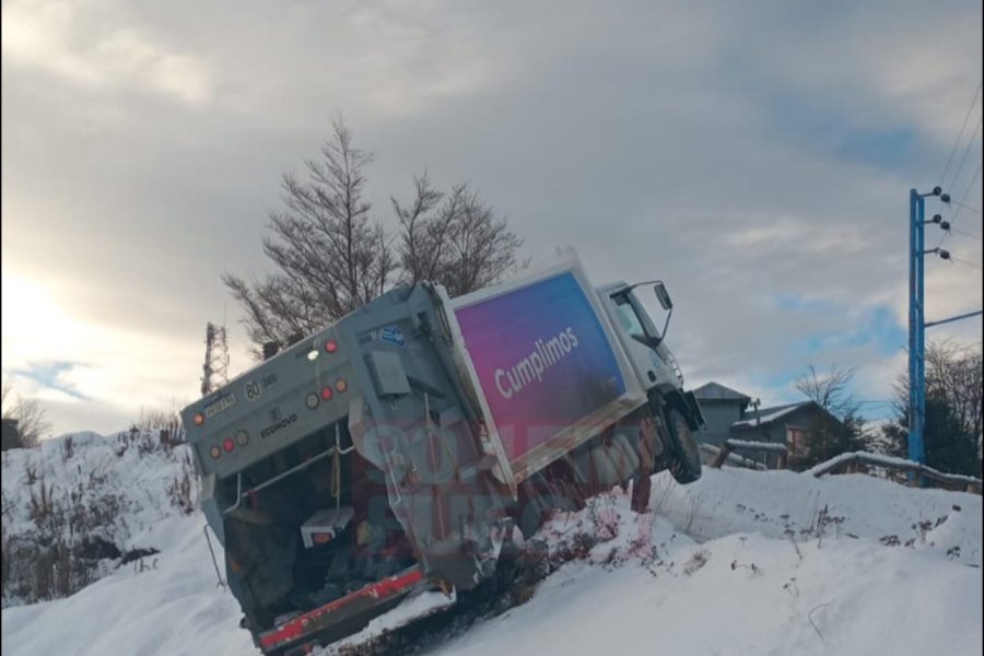 La calle resbaladiza habría sido el principal factor que provocó que una de las ruedas delanteras se elevara, dejando al vehículo bloqueando parcialmente el tránsito.