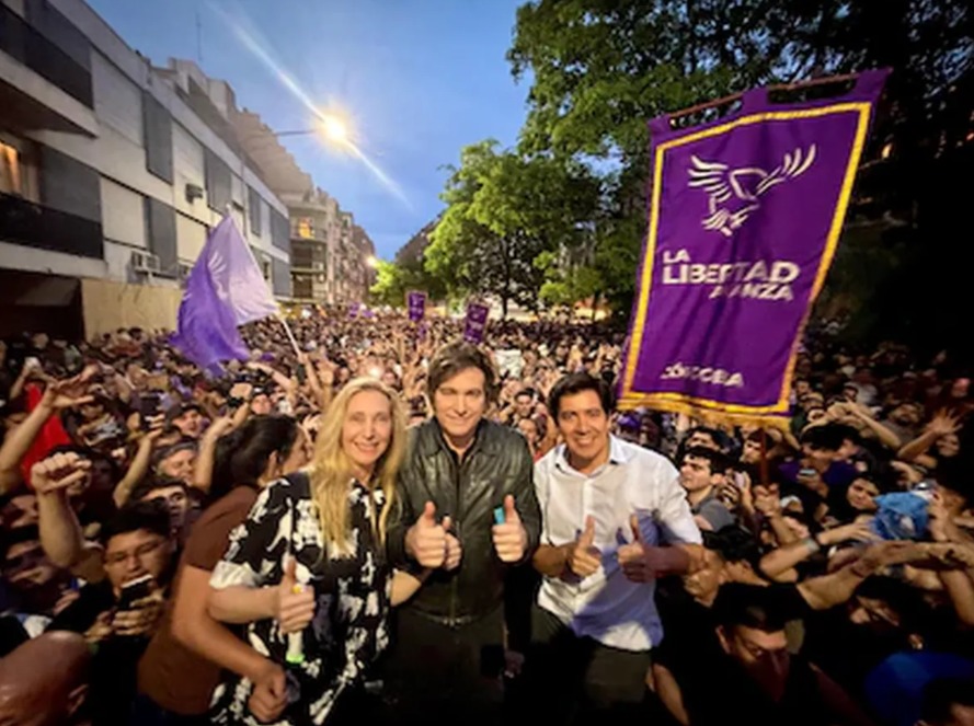 Rodeado de militantes libertarios, Javier Milei brindó un mensaje con un megáfono desde la parte trasera de una camioneta, acompañado por su hermana, Karina Milei, y el candidato a diputado nacional por Córdoba de La Libertad Avanza, Gonzalo Roca.