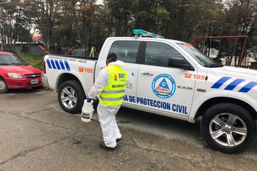 La Secretaría de Protección Civil de la provincia, dependiente del Ministerio de Gobierno, Justicia y Derechos Humanos, realiza la desinfección de los móviles que se encuentran afectados, tanto a la logística, como al apoyo de los controles dentro y fuera de las 3 ciudades de nuestra provincia.