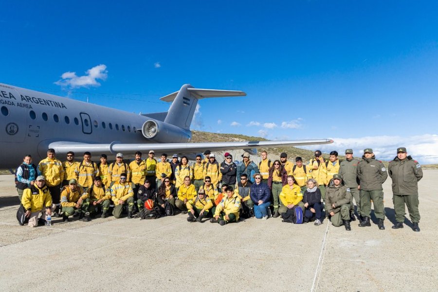 La ministra de Producción y Ambiente, Sonia Castiglione junto a la secretaria de Ambiente, Eugenia Alvarez recibieron, este domingo en el Aeropuerto Internacional Malvinas Argentinas de Ushuaia, al equipo de brigadistas de la regional Patagonia y de Parques Nacionales que se sumarán a la lucha del incendio declarado en la Reserva Provincial Corazón de la Isla. También arribó, la coordinadora de la Regional Patagonia del Servicio Nacional de Manejo del Fuego, Carolina Juarez, quien se sumará al operativo conjunto.