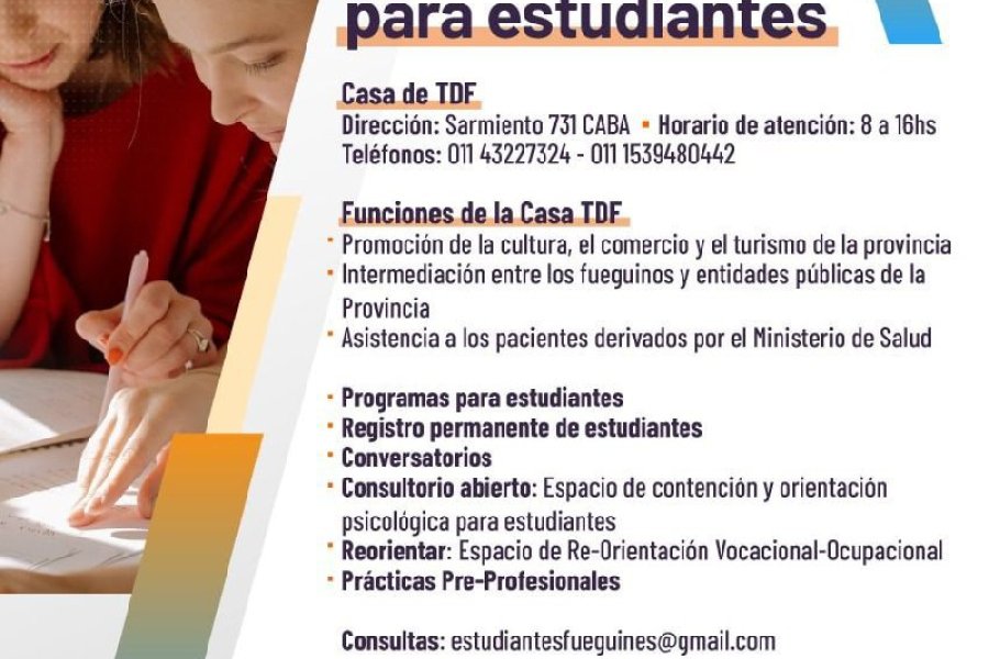 La charla estará a cargo de referentes de la Casa Tierra del Fuego de la ciudad de Buenos Aires, con el objetivo de dar a conocer los diferentes programas y actividades con los que cuenta la misma. Está destinada principalmente a las y los estudiantes que se encuentren con intención de realizar sus estudios superiores fuera de la provincia, como así también a aquellos que actualmente se encuentren cursándolos.