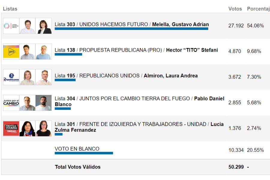 En cuarto lugar Pablo Daniel Blanco de Juntos por el Cambio Tierra del Fuego, lleva el 5,68% (2.855) y en el último lugar se encuentra Lucia Zulma Fernández de Frente de Izquierda y Trabajadores con el 2,74% (1.376)
