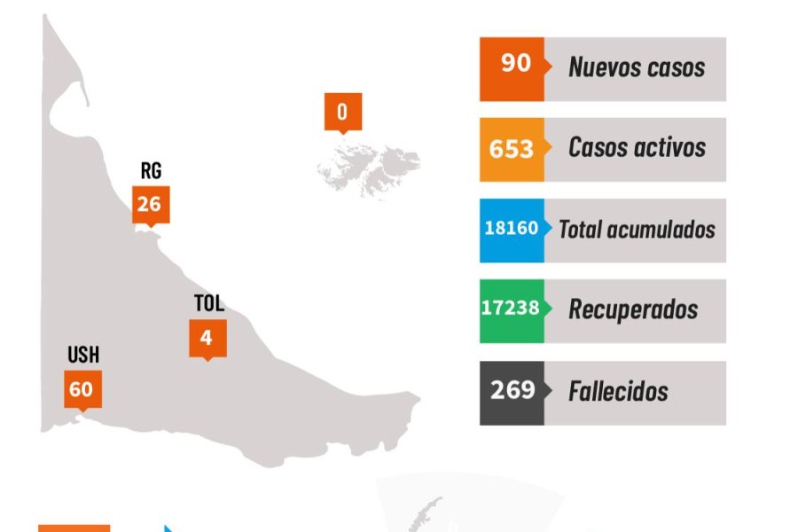 En Tolhuin se registran 116 casos totales por PCR. Se registra a la fecha 2 pacientes fallecidos.