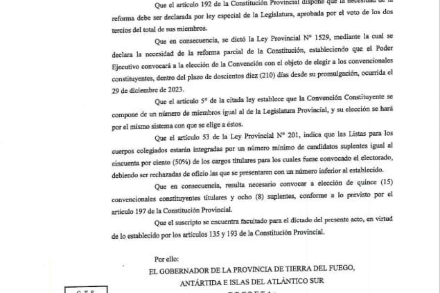 En los considerandos, el Decreto firmado por el Gobernador Melella cita la Ley 1529 aprobada por mayoría especial de la Legislatura Provincial y promulgada el 29 de diciembre de 2023, la cual establece que el Poder Ejecutivo convocará a la elección de la Convención en un plazo de 210 días con el objeto de elegir convencionales constituyentes en un número igual al de miembros que componen la Legislatura a través del mismo sistema electoral.