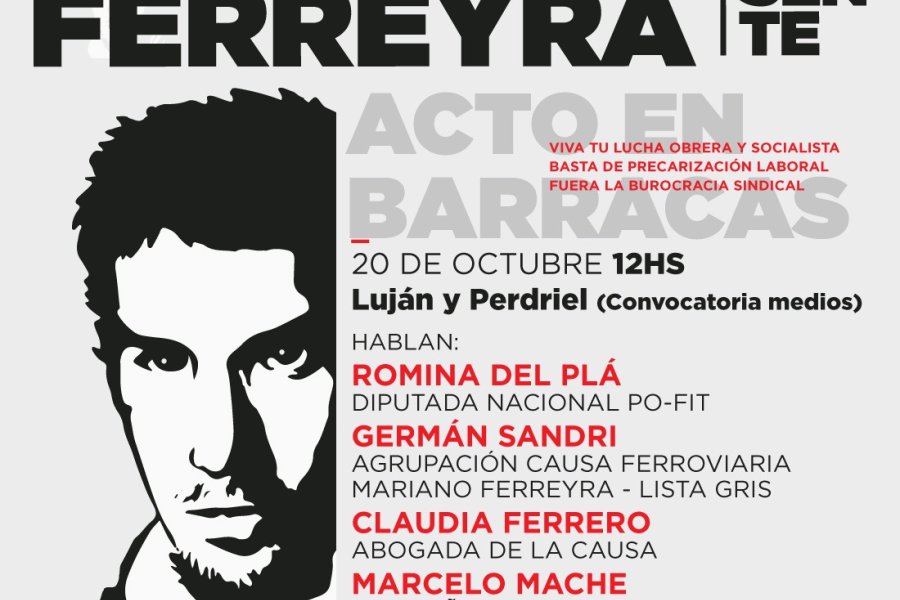 La diputada nacional del Partido Obrero y del Frente de Izquierda, Romina Del Plá, sostuvo: “Hoy la unión obrera organiza un acto en Luján y Perdriel, el lugar donde la patota de la unión ferroviaria atacó a los trabajadores ferroviarios del Roca, a las columnas del partido y pueblo obrero que se movilizaban en su apoyo y que se cobró la vida del compañero Mariano Ferreyra”.