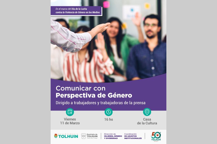 El Municipio de Tolhuin, a través de la Coordinación de Asuntos Institucionales junto a la Dirección de Mujeres, Género y Diversidad, llevará adelante el encuentro “Comunicar con Perspectiva de Género” dirigido a trabajadores y trabajadoras de la prensa, comunicadores, periodistas, estudiantes y comunidad en general. Será el viernes 11 de marzo a las 16:00hs en la Casa de la Cultura, ubicado en Lucas Bridges 350.