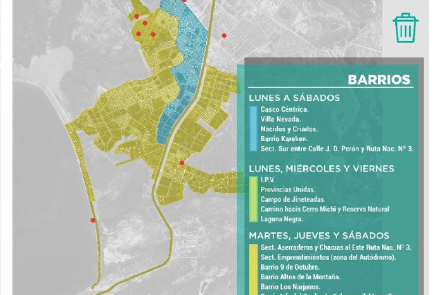 De la misma manera lo hará el camión de la basura mediante un cronograma semanal que indica días y zonas por recorrer, facilitando las tareas de recolección de residuos en la vía pública.