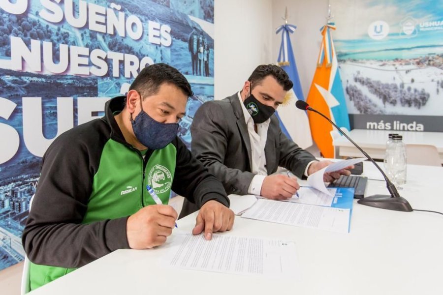 El intendente Walter Vuoto firmó junto a Abel Velázquez, Secretario General del Sindicato de choferes de camiones, obreros y empleados de Transporte Automotor, y el secretario gremial seccional Tierra del Fuego, Daniel Capdveilla, un convenio por el que la Municipalidad afecta una porción de tierra fiscal municipal a la custodia del sindicato para construir 40 viviendas para sus afiliados. También participaron la secretaria de Hábitat y Ordenamiento Territorial, Lorena Henriques Sanches y la Subsecretaria de Desarrollo Territorial Arq. Irupe Petrina.