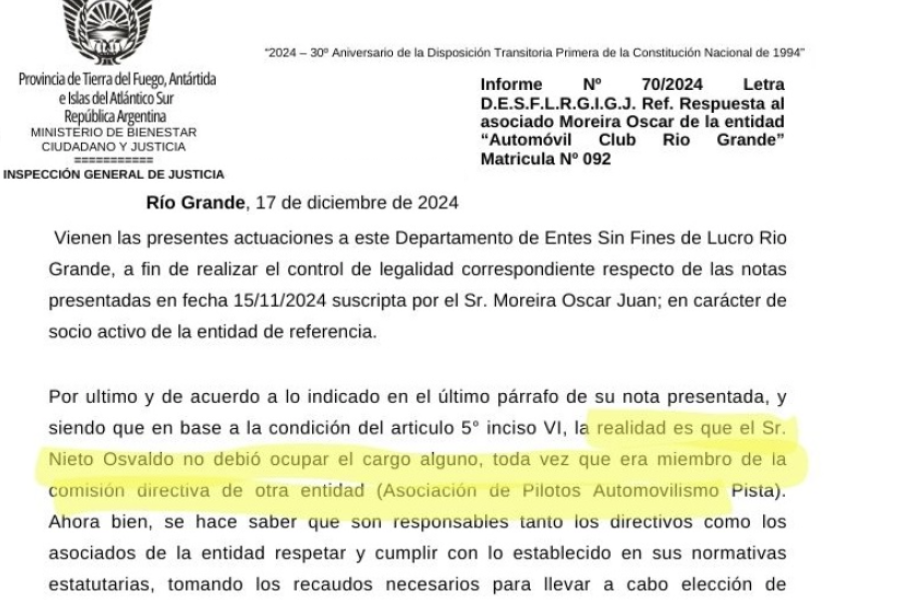 En este punto en particular, el ACRG entiende que no existe conflicto de intereses y que no hay inconveniente alguno que Osvaldo Nieto sea presidente de la institución y al mismo tiempo de la APAP.De todas maneras, más allá de un descargo que carece de todo sustento al explicar por qué entienden que no hay conflicto de intereses, en la nota presentada no hace ninguna mención al pedido de una asamblea por parte de los socios de la institución.Se pudo saber, que la IGJ exigirá al ACRG que convoque a sus socios a la asamblea que éstos han solicitado, donde se deberá tratar entre otros puntos, la validez de Osvaldo Nieto como presidente de acuerdo a lo que dice el artículo 5, inciso VI del estatuto de la institución.Mientras tanto el tiempo pasa, pueden llegar a pasar otros 30 días hasta que haya una definición y la organización de la edición N° 50 del GPH sigue en veremos.