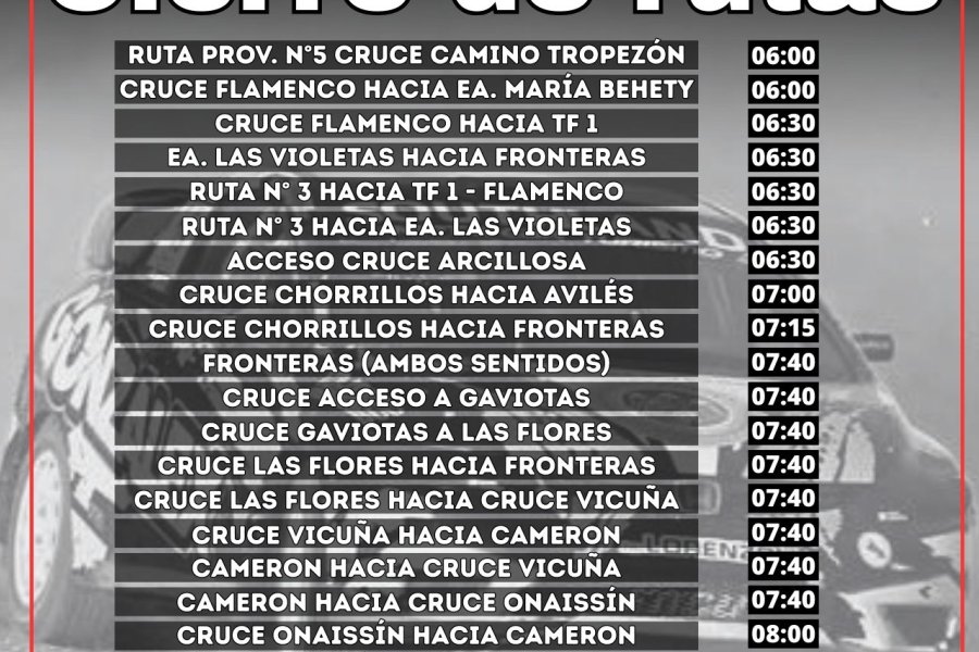 El ACRG (Automóvil Club Río Grande), dio a conocer los horarios de cierre de rutas durante el desarrollo de la primera etapa de la edición N° 50 del Gran Premio de la Hermandad que se realizará el sábado 16 de agosto desde las 9:00 horas.