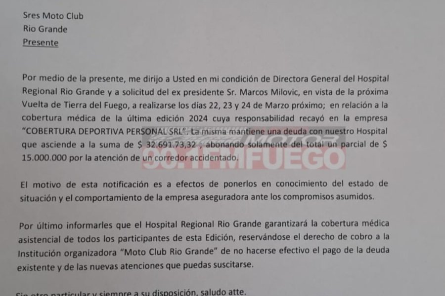 En la misma expresa que la empresa Cobertura Deportiva Personal tiene una deuda de $32.91.730,32 y que, si la misma no es abonada, prestará el servicio, pero se reserva el derecho de cobrar el mismo al Moto Club Río Grande, club organizador.Todas las reacciones:2929