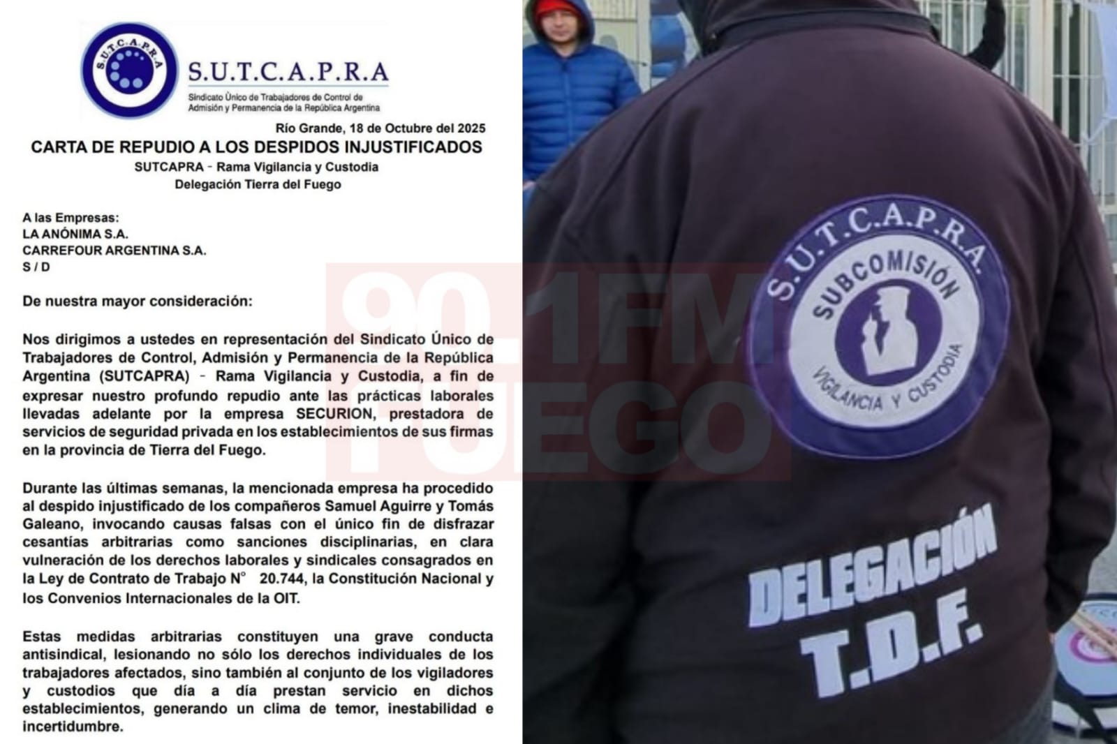 A través de una nota dirigida a las cadenas de supermercados, el gremio expresó su “profundo repudio ante las prácticas laborales llevadas adelante por la empresa Securion, prestadora de servicios de seguridad privada en los establecimientos de sus firmas en la provincia de Tierra del Fuego”.