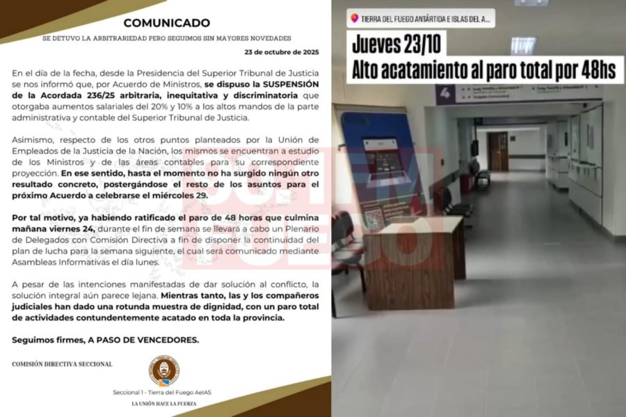 “A los fines de profundizar el análisis de las cuestiones planteadas por las diferentes agrupaciones sindicales que representan al personal del Poder Judicial, Unión de Empleados de Justicia de la Nación, Sindicato Empleados de Justicia de la provincia de Tierra del Fuego y de la Asociación de Magistrados y Funcionarios, el Superior Tribunal de Justicia proseguirá el dialogo en la mesa de trabajo que se había dispuesto para el transcurso del presente año”, indicó el comunicado oficial del STJ.