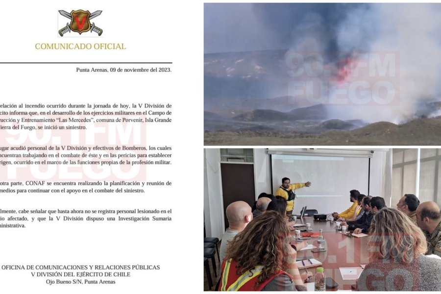 En relación al incendio ocurrido durante la jornada de hoy la V División de Ejército informa que, en el desarrollo de los ejercicios militares en el Campo de Instrucción y Entrenamiento "Las Mercedes*, comuna de Porvenir, Isla Grande de Tierra del Fuego, se inició un siniestro.