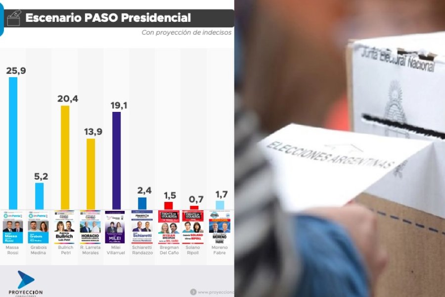 En total, Unión por la Patria obtendría un 31,1% de los votos, incluyendo los de Juan Grabois (5,2%). En Juntos por el Cambio, Patricia Bullrich se perfila como la ganadora de la interna con el 20,4% de los votos. Por su parte, el partido de Javier Milei se ubicaría en tercer lugar con un 19,1%.