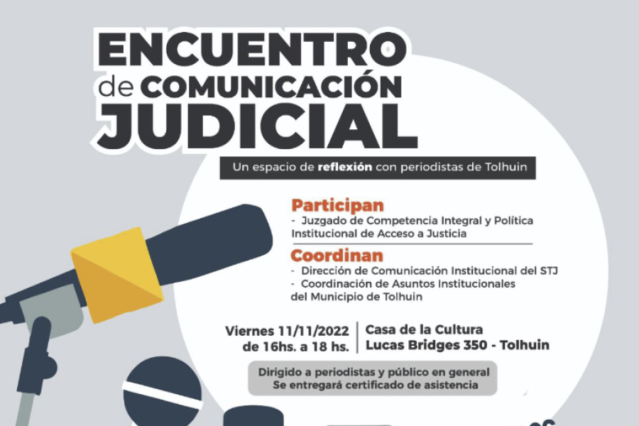USHUAIA.- El Poder Judicial de la provincia de Tierra del Fuego, Antártida e Islas del Atlántico Sur y el Municipio de Tolhuin, invitan a periodistas de Tolhuin y comunidad en general a participar del espacio de reflexión en materia de Comunicación Judicial, que se ofrecerá este viernes 11 de noviembre, de 16 a 18.