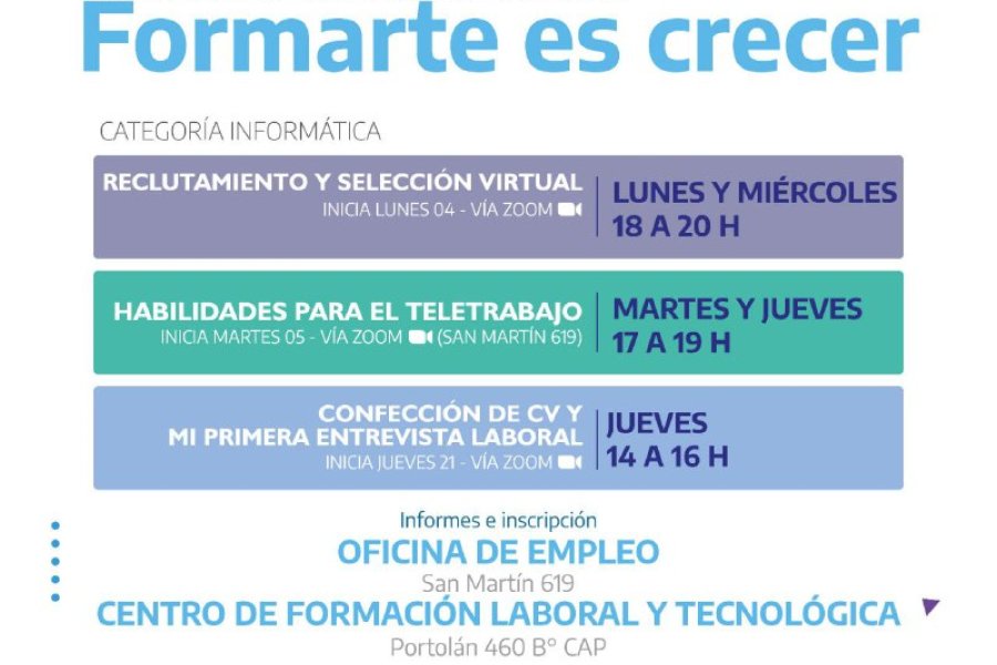 En septiembre darán inicio nuevos cursos y talleres del Programa Municipal “Formarte es Crecer", correspondientes a la categoría informática, tales como Reclutamiento y Selección Virtual; Habilidades para el Teletrabajo; Confección de CV y Mi primera entrevista laboral.