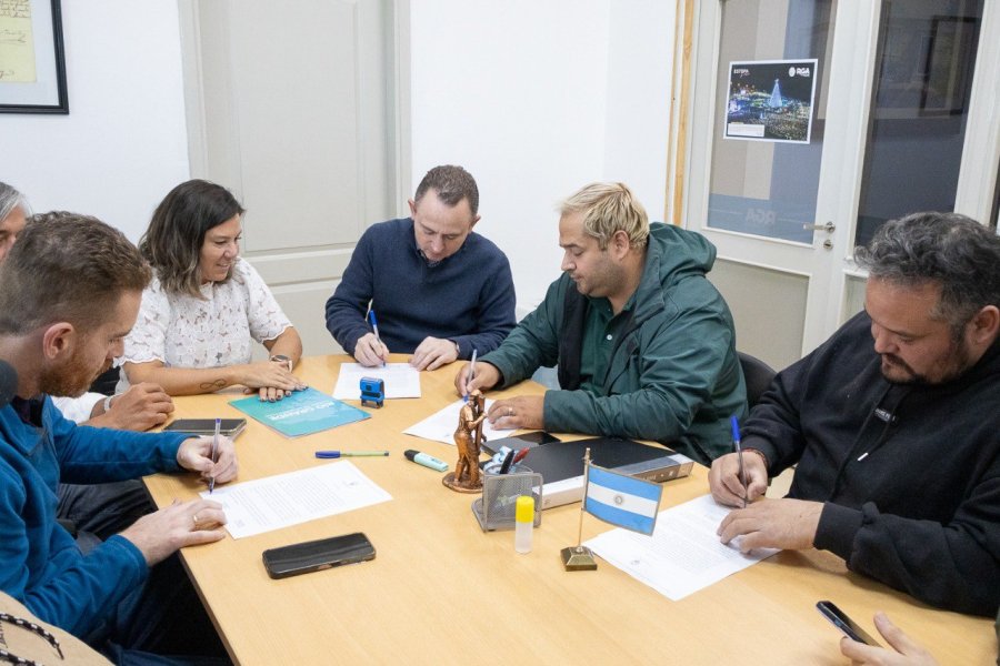 El secretario de Gobierno Gastón Díaz, junto a representantes del gremio S.I.T.O.S, entre ellos Diego del Estal, Matías Calderón y Daniel Villafañe, firmaron un nuevo acuerdo de recomposición salarial para los trabajadores y trabajadoras municipales de Obras Sanitarias. También estuvieron presentes: la secretaria de Finanzas, Valeria Capotorto y el subsecretario Nicolás Giordano.