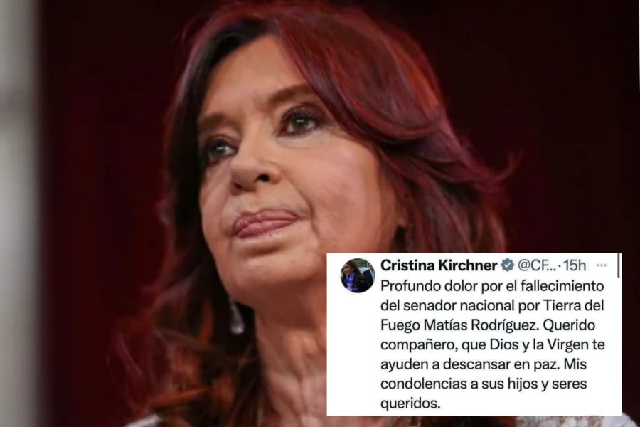 "Profundo dolor por el fallecimiento del senador nacional por Tierra del Fuego Matías Rodríguez. Querido compañero, que Dios y la Virgen te ayuden a descansar en paz. Mis condolencias a sus hijos y seres queridos", escribió Cristina Fernández de Kirchner en su cuenta de Twitter.
