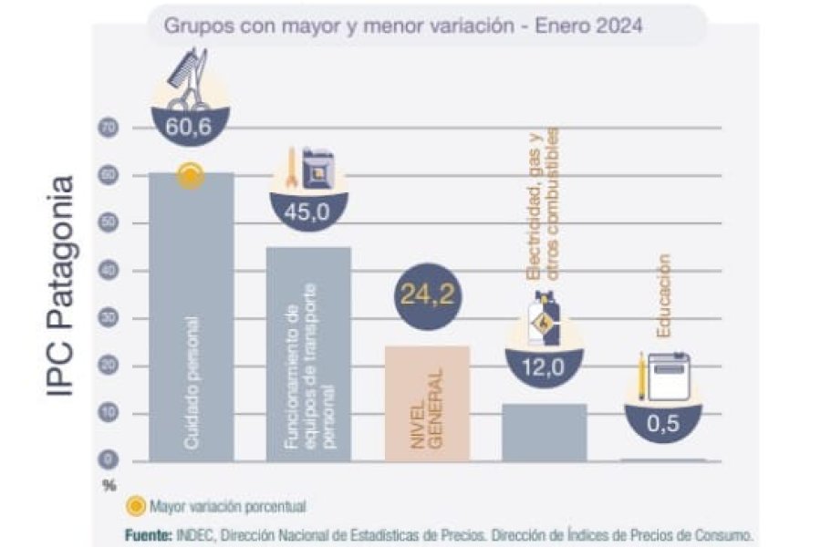 En la Región Patagónica, donde está incluido el conglomerado Ushuaia-Río Grande, la inflación de enero se ubicó en el 24,2% y resultó estar 3,6 puntos por encima de la media nacional que fue del 20,6% según el informe que dio a conocer el INDEC, en el relevamiento mensual del Índice de Precios al Consumidor.