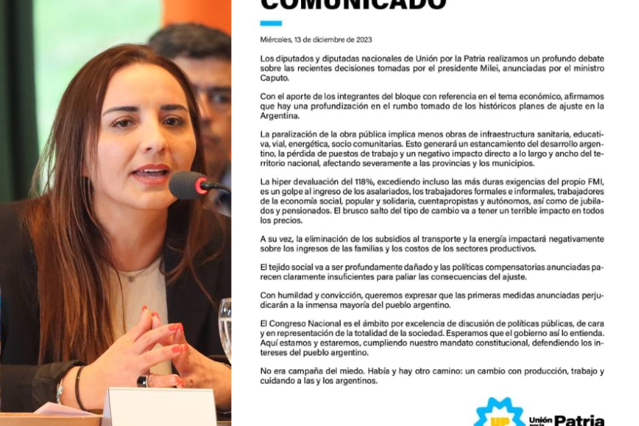 “Los diputados y diputadas nacionales de Unión por la Patria realizamos un profundo debate sobre las recientes decisiones tomadas por el presidente Milei, anunciadas por el ministro Caputo”.