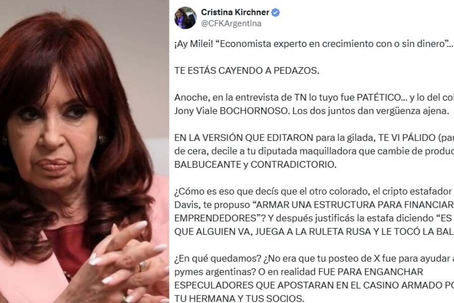 En redes sociales, la expresidenta, Cristina Kirchner, arremetió contra el presidente Javier Milei luego del escándalo por la criptomoneda $LIBRA y la entrevista que brindó en TN. En un extenso mensaje publicado en redes sociales, la exmandataria expresó: “¡Ay Milei! ‘Economista experto en crecimiento con o sin dinero’… TE ESTÁS CAYENDO A PEDAZOS”. También apuntó contra el periodista Jonatan Viale y el asesor presidencial Santiago Caputo.