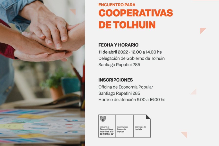 El Gobierno de Tierra del Fuego AeIAS, a través de la Secretaría de Economía Popular perteneciente al Ministerio de Desarrollo Humano en conjunto con la Secretaría de Justicia, convoca a las cooperativas de trabajo de dicha localidad a una charla informativa el día 11 de abril en la Delegación de Gobierno de Tolhuin (Santiago Rupatini 285) en el horario de 12 a 14 hs.