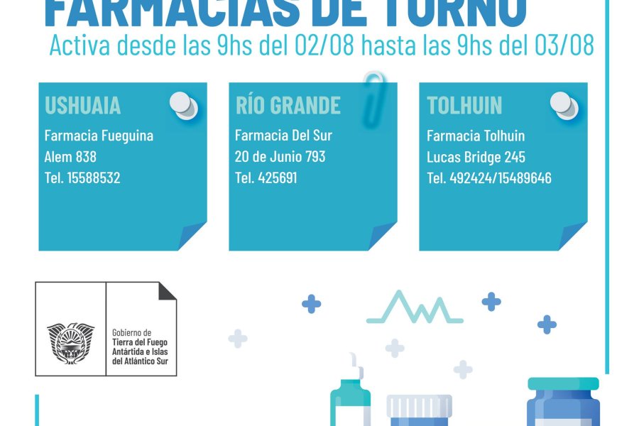 Se informa la farmacia de turno del día de la fecha es Farmacia Del Sur, en la ciudad de Río Grande , sita en calle: 20 de Junio N*793. En Tolhuin se encuentra de turno la Farmacia Tolhuin de Lucas Bridge  N*245 y en Ushuaia es la Farmacia Fueguina,  ubicada en la calle Alem N*838.