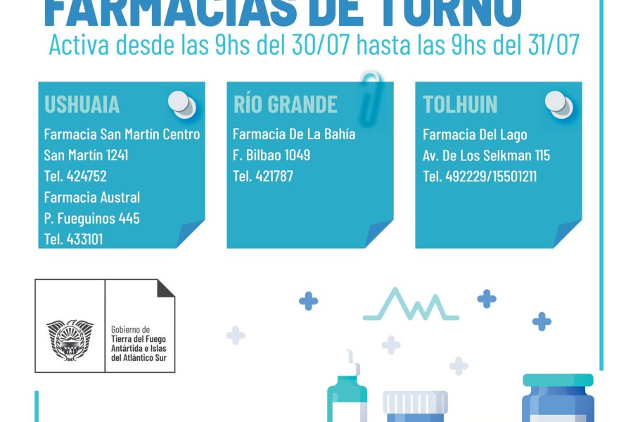 Se informa la farmacia de turno del día de la fecha es Farmacia De La Bahía, en la ciudad de Río Grande , sita en calle: Bilbao N*1049. En Tolhuin se encuentra de turno la Farmacia Del Lago de Avenida de los Selknam N*115 y en Ushuaia es la Farmacia San Martin Centro, ubicada en la calle San Martin N*1241 y Farmacia Austral de calle Pioneros Fueguinos N*445.