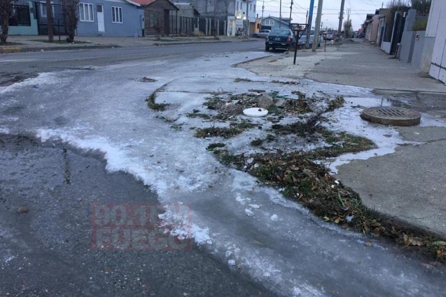 La intersección entre Rafael Obligado y Padre Forgacs se suma a la lista de sectores de la ciudad en pésimo estado, por las pérdidas de agua y su posterior congelamiento debido a las temperaturas bajo cero que está viviendo Río Grande en esta época.