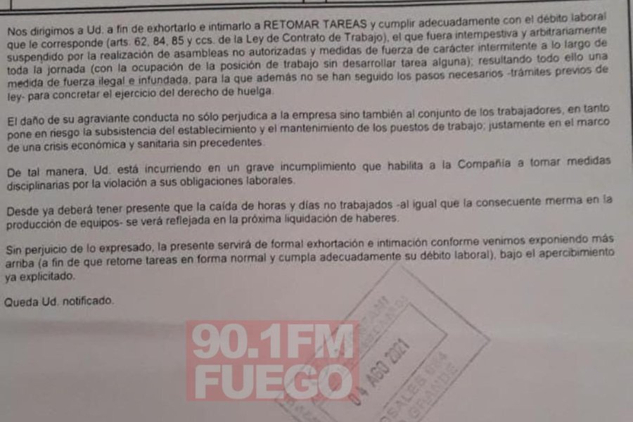 En diálogo con FM Fuego, Lorenzo Martín, uno de los empleados de la fábrica, confirmó que la empresa les mandó una carta documento a todos los empleados con el fin de finalizar con las protestas.